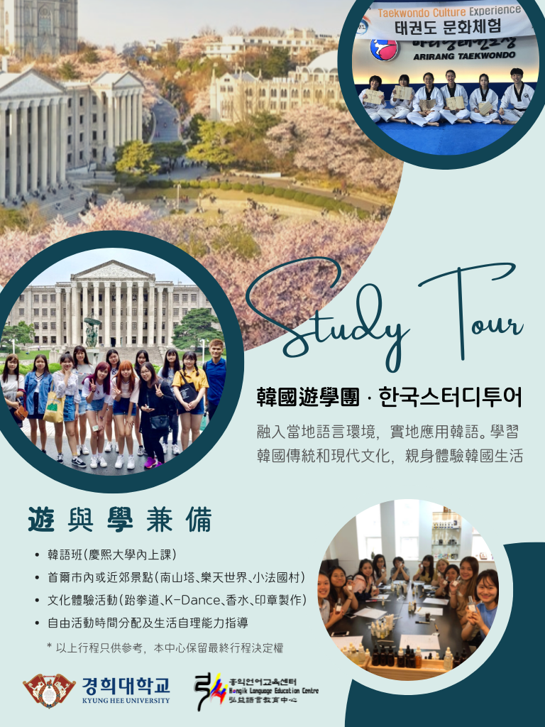 每年暑假,本校都會與韓國慶熙大學合辦為期一個月的韓國暑期遊學團,讓學生在暑假親身體驗韓國文化及韓國生活,提高韓語水平。